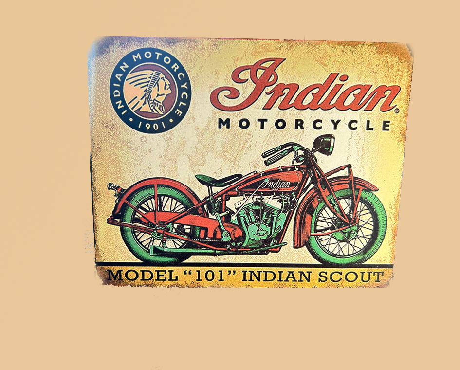 Matricula vintage con logo de Indian y una moto. de aluminio 20×15 código (0003)